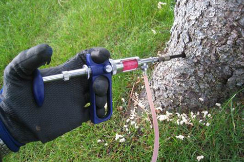 La endoterapia (inyección en el tronco) consiste en introducir un preparado fitosanitario directamente en el sistema vascular de una planta mediante una inyección, con el fin de que se distribuya a través de la savia. Este método se utiliza para controlar plagas en árboles de especial interés, en áreas sensibles donde no se permite la dispersión de aerosoles ni la posible contaminación del suelo o del agua por fitosanitarios, y para tratar árboles aislados. La endoterapia no genera aerosoles ni olores, y presenta un riesgo mínimo de exposición para los operarios, las personas en general y los animales, por lo que la reentrada a las áreas tratadas no presenta problemas. Es una opción adecuada para tratar espacios difíciles de desalojar como campings, centros escolares, hospitales, estaciones de tren, aeropuertos o áreas cercanas. La inyección se realiza preferentemente en la parte inferior del árbol, buscando la zona de máxima vascularización. Se debe evitar inyectar entre las raíces o cerca de heridas, nudos o anomalías fisiológicas. Si se usan inyectores fijos, se deben colocar a suficiente altura para evitar el contacto con las personas. Se accede al xilema con la ayuda de un taladro mecánico, introduciendo la inyección a una profundidad de entre 2 y 4 cm (sin contar la corteza). Para árboles de porosidad anular, como encinas y robles, se utilizarán profundidades menores, mientras que en coníferas se aplicará a profundidades mayores. En palmeras, para el control del picudo, la profundidad del orificio será mayor, considerando como adecuado un tercio del diámetro del estípite (tronco).