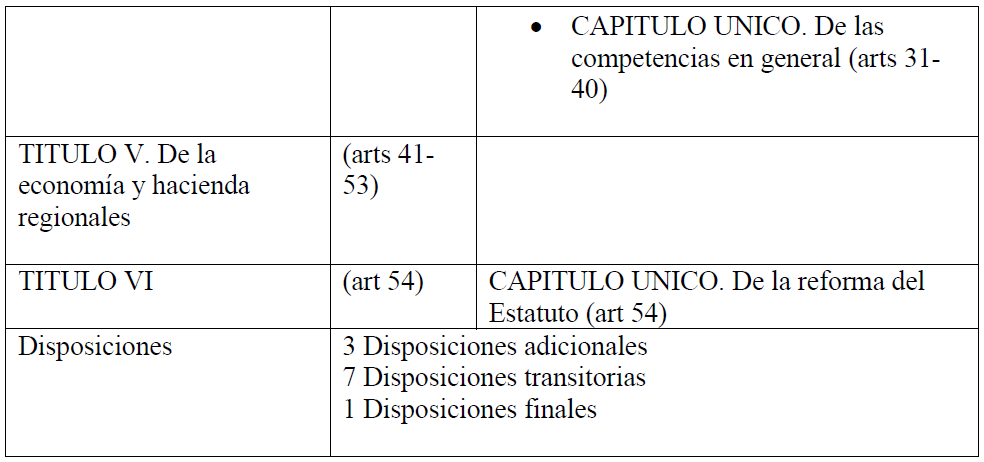 El Estatuto de Autonomía es la norma institucional básica de la región, consta de 54 artículos y se estructura en un Título Preliminar, 6 Títulos, 2 disposiciones adicionales, siete disposiciones transitorias y una disposición final.