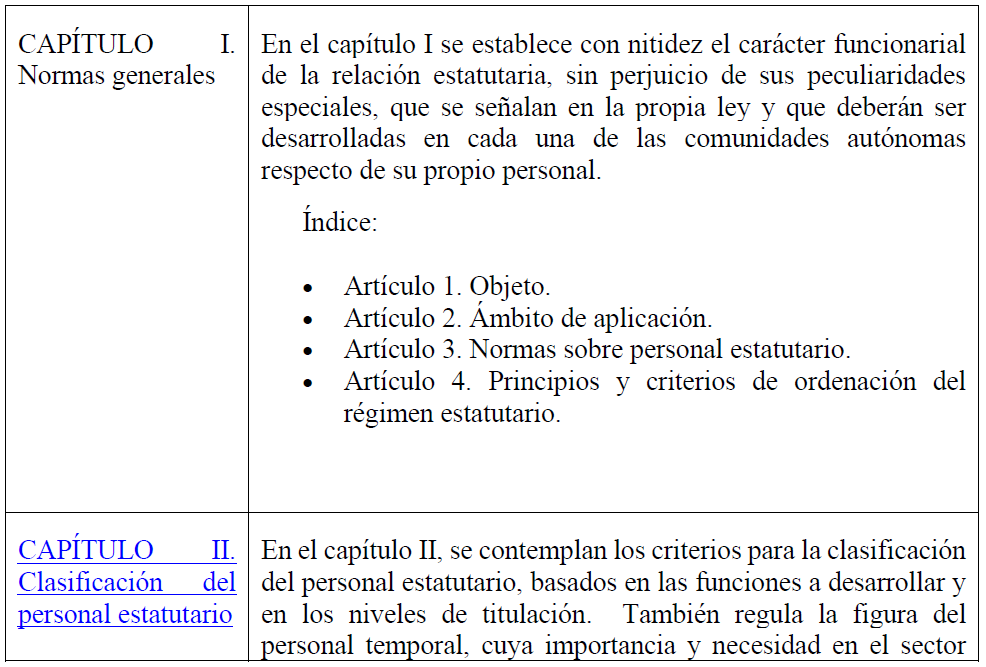 Los objetivos de esta nueva regulación merecen una mención antes de adentrarnos a estudiar el articulado de la norma: incrementar la motivación de los profesionales y su compromiso con la gestión, el establecimiento de un adecuado sistema de incentivos, la desburocratización y flexibilización de las relaciones profesionales, la descentralización de los procesos de selección y de promoción profesional, la personalización de las condiciones de trabajo, especialmente en lo relativo a retribuciones y niveles de dedicación o la adecuación de las dotaciones de personal a las necesidades efectivas de los centros, a través de una normativa específica de carácter básico para este personal, con respeto tanto de las competencias para su desarrollo por las comunidades autónomas como del objetivo global de impulsar la autonomía de gestión de los servicios, centros e instituciones.