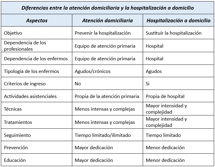 La hospitalización domiciliaria es un recurso complementario que refuerza otros niveles asistenciales, adaptándose a las necesidades específicas de la población y el modelo sanitario vigente. Aunque muchos países han adoptado el modelo francés, que distingue entre hospitalización domiciliaria y atención domiciliaria desde Atención Primaria, existen diferencias claras entre ambas modalidades. Estas diferencias pueden dividirse en aspectos organizativos y asistenciales: