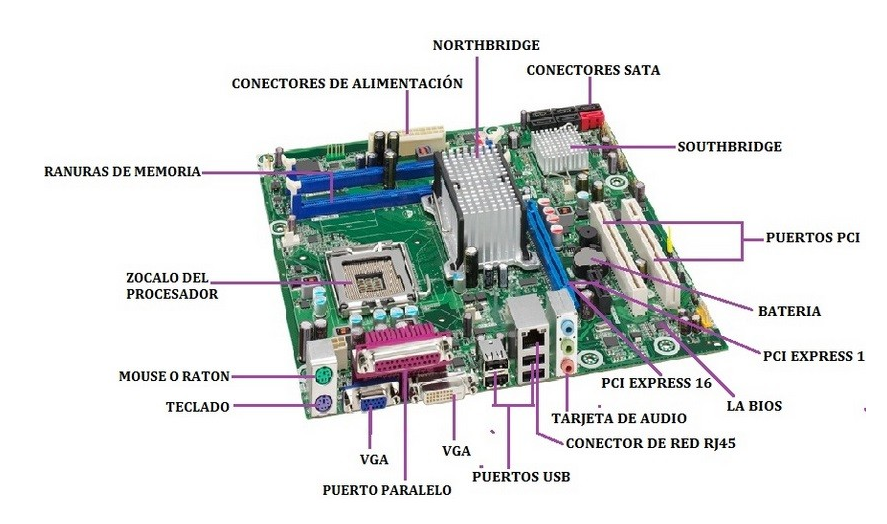 También conocida como tarjeta madre, placa madre o placa principal. Se trata de una tarjeta de circuito impreso donde se conecta todos los componentes que constituyen un ordenador.