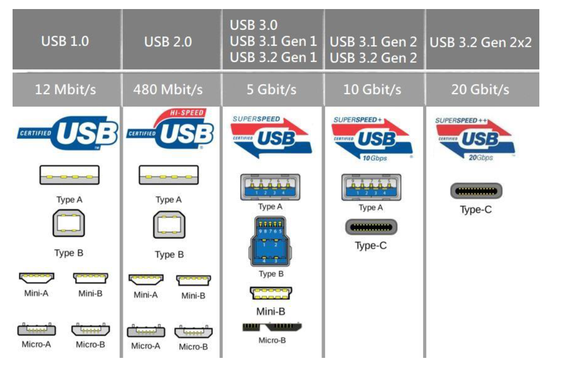 ο  Puerto USB, Bus Universal en Serie (en inglés: Universal Serial Bus). Se trata de un estándar de comunicaciones que define los cables, conectores y protocolos usados en un bus para conectar, comunicar y proveer de alimentación eléctrica entre computadoras, periféricos y dispositivos electrónicos. Es el estándar actual para conectar el ordenador con teclados, ratones, impresora, teléfonos, escáneres, etc. Actualmente se ha publicado hasta la versión 4.0., que soporta una transferencia de hasta 40 Gbit/s. El USB Type C o de tipo C es un tipo de conector con formato pequeño, y que sirve para conectar desde cables hasta memorias USB de diferentes estándares. No influye en la velocidad de transferencia. Es el sucesor del micro-USB