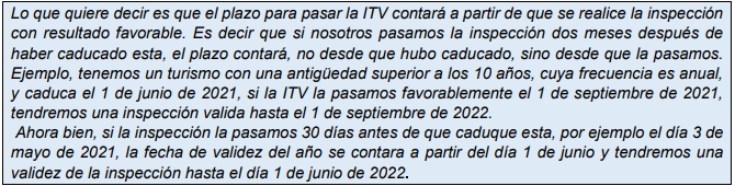 1. El plazo de validez de las inspecciones técnicas periódicas se obtendrá adicionando a la fecha en la que el resultado de la inspección haya sido favorable la frecuencia indicada en este artículo. No obstante, si dicha fecha está comprendida en los 30 días naturales precedentes a la expiración del plazo de validez de la inspección anterior, el plazo de validez se obtendrá adicionando la frecuencia correspondiente a la citada fecha de expiración.