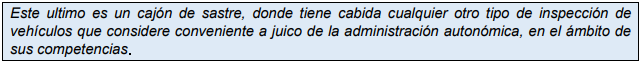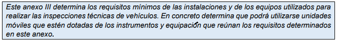 Dicho anexo I constituye una lista no exhaustiva de defectos, por lo que se desarrollará con base en las especificaciones que deben satisfacer todos los elementos inspeccionados, según el presente Real Decreto y la reglamentación que sea de aplicación, caso por caso y de forma particularizada en función de la categoría del vehículo, su uso o servicio y demás especificidades establecidas en la reglamentación, a través del manual de procedimiento de inspección de las estaciones ITV. Dicho manual detallará los métodos de inspección establecidos en el anexo I, de forma que constituyan un verdadero procedimiento armonizado de inspección en todo el territorio nacional.