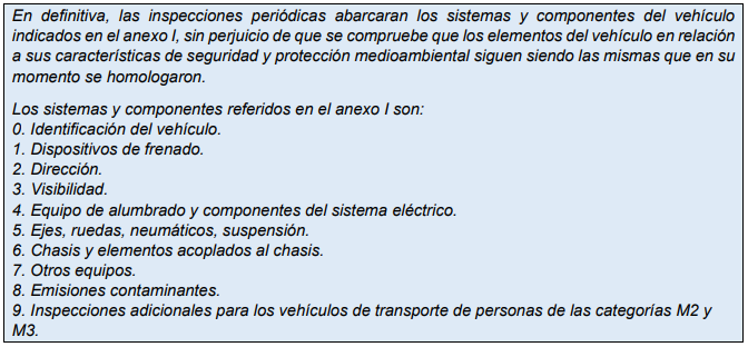 1. Las inspecciones técnicas periódicas abarcarán los sistemas y componentes del vehículo que se indican en el anexo I.