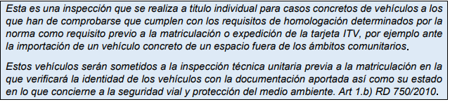 1. Inspecciones técnicas previas a la matriculación, o realizadas para la expedición de tarjetas ITV, en los casos previstos en el Real Decreto 750/2010, de 4 de junio, por el que se regulan los procedimientos de homologación de vehículos de motor y sus remolques, máquinas autopropulsadas o remolcadas, vehículos agrícolas, así como de sistemas, partes y piezas de dichos vehículos, y sus posibles revisiones.