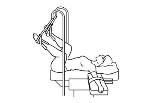– Colocar las piernas en las perneras a la vez, para evitar luxaciones de la cadera, el enfermo habrá situado previamente la zona glútea en el extremo distal de la mesa, para prevenir tensión en músculos y ligamentos lumbosacros. Es fundamental el adecuado almohadillado de las perneras. Las piernas se fijan con las bandas de sujeción (las perneras se pondrán a la misma altura y en relación con el tamaño de las piernas del paciente). Una regla: siempre las perneras a las piernas, nunca las piernas a las perneras.