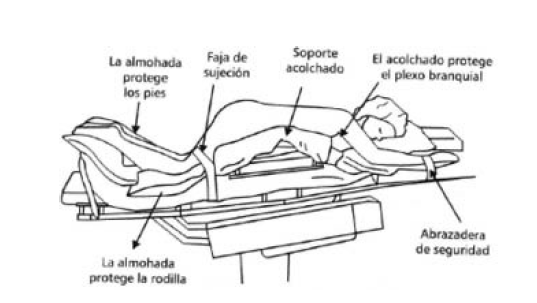 – El brazo de la venoclisis: debe apoyarse en su soporte correspondiente, pero cuidando que nunca la abducción sea superior a los 90º, por riesgo de lesionar el plexo braquial. El brazo contrario se intentará descansar en otro soporte igual, o en su defecto, sujeto al arco de anestesia perfectamente protegido y vigilando también la abducción.