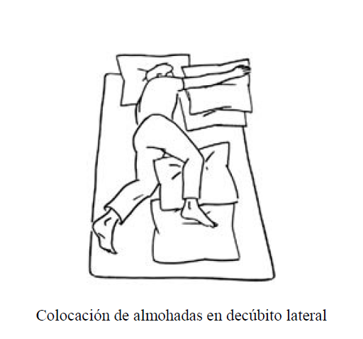 – Miembros inferiores: el superior se extiende y el inferior o yacente se flexiona en la cadera y rodilla, entre ellos se coloca una almohada; también protegemos los pies y tobillos.