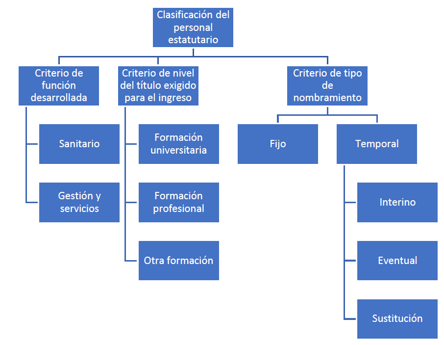 El personal estatutario de los servicios de salud se clasifica atendiendo a la función desarrollada, al nivel del título exigido para el ingreso y al tipo de su nombramiento.