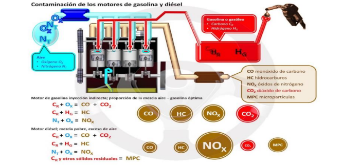 • Nitrógeno y oxigeno: óxidos de nitrógeno (NOx), debido a las altas temperaturas y presiones que se alcanzan en el momento de la combustión.