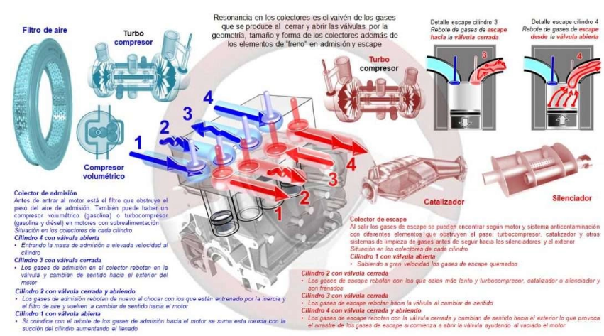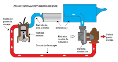 o En determinados motores, principalmente diésel y en motores de gasolina de altas prestaciones, se halla intercalado un turbo compresor o compresor mecánico, con la misión de sobrealimentar el motor, introduciendo forzadamente aire al interior de los cilindros para mejorar el llenado de estos.