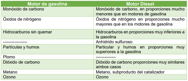 • Gases de escape: Estos son los verdaderamente responsables de la práctica totalidad de emisiones contaminantes a la atmósfera en forma de CO2, oxido de nitrógenos, monóxido de carbono, compuestos ácidos, … y del 55% de los hidrocarburos sin quemar.