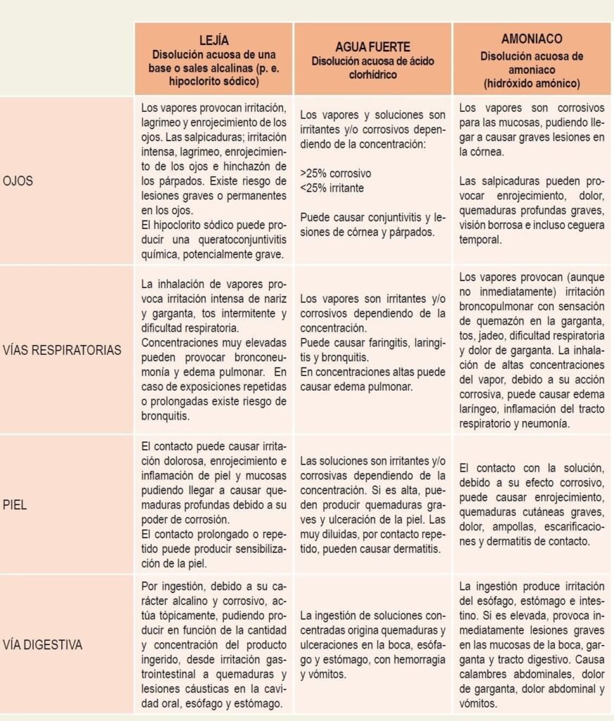 En la siguiente tabla se recogen los efectos para la salud de tres productos de uso generalizado en limpieza que pueden desprender vapores. Es importante tener en cuenta que los potenciales efectos que se indican en la tabla van a depender de la concentración del agente químico en el producto y que, en general, no se usan grandes cantidades y su utilización es en operaciones concretas y de corta duración.