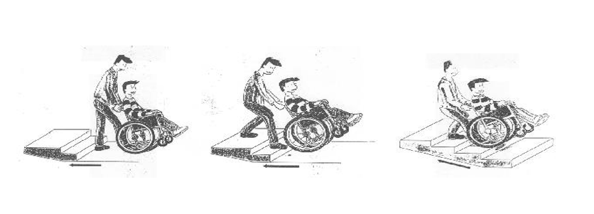 - Ira en primer lugar el celador de espaldas. Inclinara la silla apoyándola en sus dos ruedas traseras. Tirará de la silla mientras camina de espaldas.