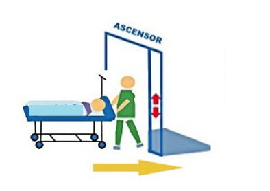 Cuando vamos a entrar en el ascensor, primero entra el celador de espaldas y tira del cabecero de la cama hacia adentro. Si el ascensor es lo suficientemente ancho, se le dará la vuelta a la cama para orientar el cabecero hacia la puerta del ascensor. Si no es así y no se le puede dar la vuelta a la cama, …cuando se vaya a sacar la cama de nuevo, el celador sale el primero de espaldas y tirando del piecero de la cama hasta que saque completamente la cama del ascensor. Si el ascensor tuviera dos puertas, no habría problema, ya que podemos entrar por una de las puertas (primero entra el celador de espaldas y tira del cabecero de la cama hacia adentro), y seguidamente sale por la puerta de enfrente, el celador sale el primero de espaldas y tirando del cabecero de la cama, (como hay dos puertas, no hay necesidad de darle la vuelta a la cama, ya que se puede salir de forma normal por la puerta de enfrente).