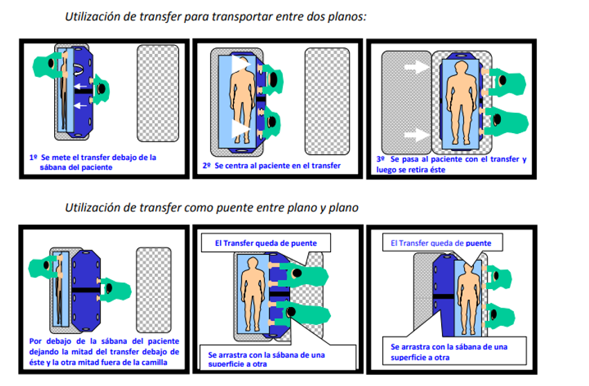 Los transfers, han supuesto una ayuda importante para el movimiento de pacientes, evitando movimientos dolorosos para ellos y esfuerzos físicos para el personal, ya que la capacidad de carga es muy elevada y su utilización muy simple. Sirve para deslizar de un plano a otro al paciente.