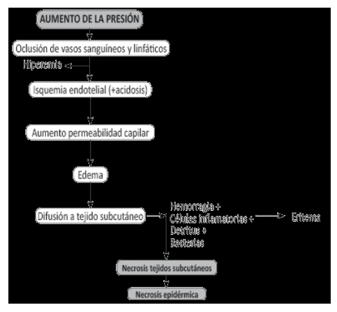 Como ya hemos dicho, las UPP se producen como consecuencia del aplastamiento tisular entre dos planos, uno perteneciente al paciente (hueso) y otro generalmente externo a él (sillón, cama, etc) En la formación de las úlceras por presión parece tener más importancia la continuidad en la presión, incluso aunque esta sea moderada que la intensidad de la misma, ya que la piel puede soportar presiones elevadas, pero sólo durante cortos periodos de tiempo.