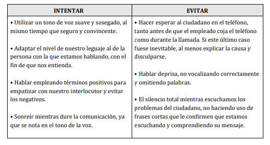 - Expresiones que puedan provocar agresividad, poniendo en duda las palabras del ciudadano: “está usted equivocado”, “no es cierto”, “no me ha entendido”.