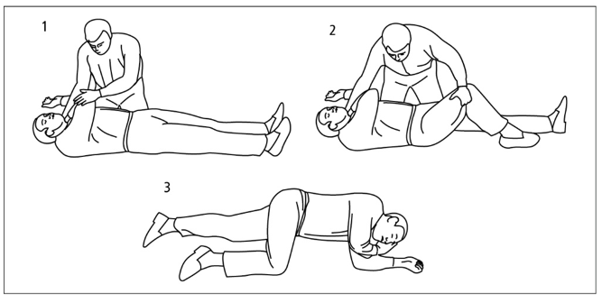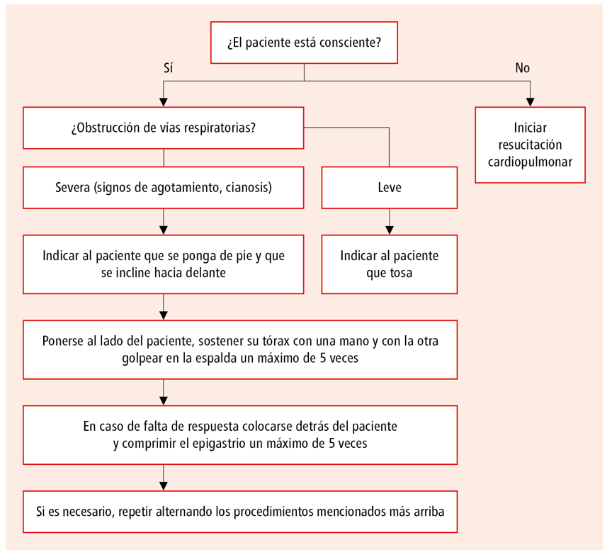 - Paciente inconsciente→ llamar una ambulancia, colocar al paciente en decúbito dorsal, comprimir rítmicamente la parte media del esternón con la profundidad de 5-6 cm y con frecuencia 100-120/min. Después de 30 compresiones del esternón flexionar la cabeza del paciente hacia atrás y verificar si el cuerpo extraño se encuentra en la cavidad oral o en la garganta. Si es así, intentar retirarlo hacia afuera con un dedo teniendo cuidado de no empujarlo más profundamente. No temer ser mordido: un paciente profundamente inconsciente está fláccido y no consigue morder. Continuar la compresión de la caja torácica y los intentos de retirar el cuerpo extraño. Una alternativa es colocar al paciente en posición lateral de seguridad y comprimir su costado desde arriba.