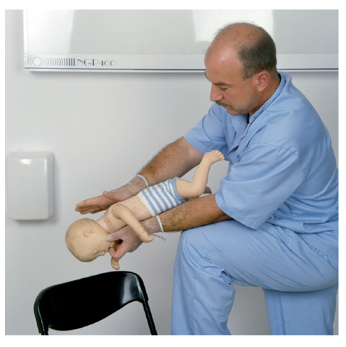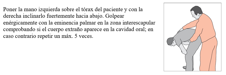 - Niño mayor→ sentarse y colocar al niño sobre las rodillas con la cabeza hacia abajo. En esta posición golpearlo un máx. 5 veces en la zona interescapular. En caso de falta de mejoría alternar ambos procedimientos, repitiendo 5 veces cada uno hasta que den resultados o hasta la pérdida de conciencia. En caso de pérdida de conciencia → iniciar la resucitación. Una alternativa consiste en comprimir los costados de la caja torácica del niño flexionado sobre las rodillas