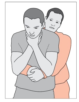 Si aún no hay resultados → colocarse detrás, rodear al paciente con los brazos por debajo de sus axilas, colocar el puño izquierdo un poco por debajo del apéndice xifoides, agarrarlo con la mano derecha y desplazar ambas manos muy enérgicamente hacia sí y hacia arriba, para lograr un aumento de presión dentro del tórax mediante presión sobre el diafragma