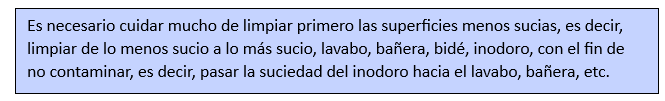 Es importante seguir algunos principios de limpieza: comenzar limpiando las superficies menos sucias para evitar la contaminación cruzada, es decir, limpiar de lo menos sucio a lo más sucio (lavabo, bañera, bidé, inodoro) y limpiar de arriba hacia abajo y de dentro hacia fuera.